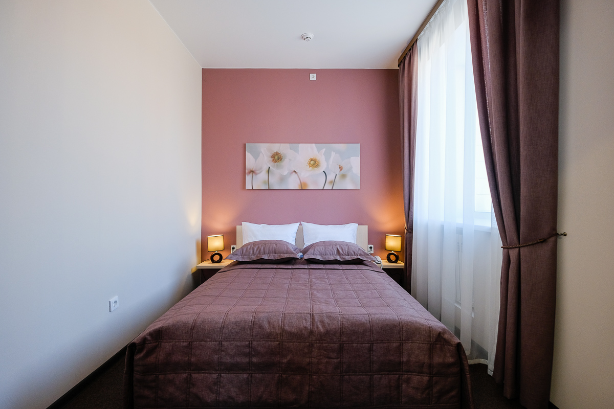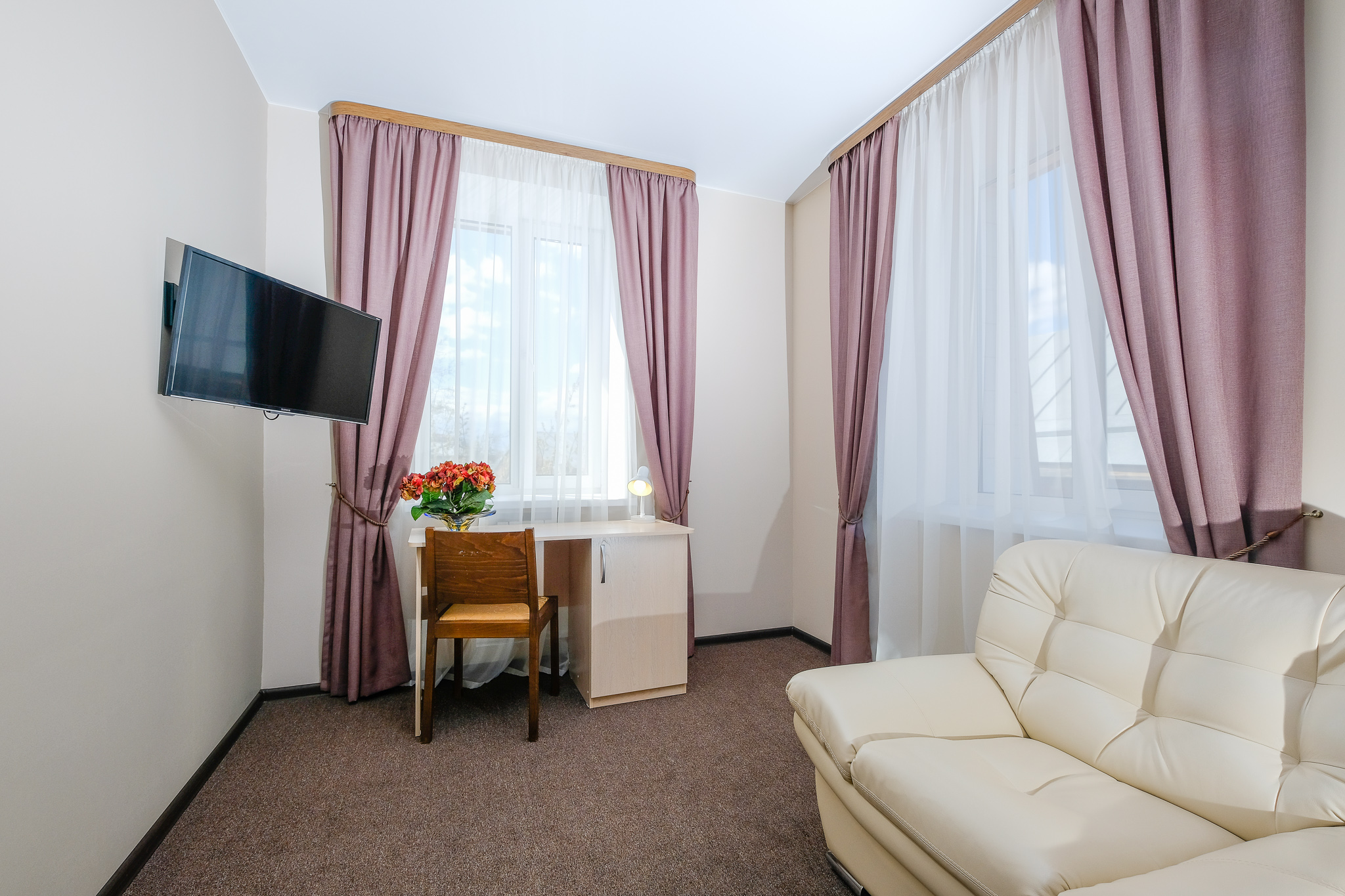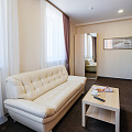 | На просторных 45 кв.м. две отдельные зоны. Спальня оборудована большой и удобной двуспальной кроватью, телефоном для внутренней и городской связи. Вторая комната располагает мягким и удобным диваном и креслом с журнальным столиком, ЖК-телевизором. Просторный санузел с душем, предоставляются зубной набор, шапочка для душа, шампунь, гель для душа и мыло, фен. Для работы Вы можете воспользоваться рабочим письменным столом, бесплатным wi-fi на территории всего Отеля. Позавтракать вы можете в кафе при отеле, либо заказать еду в номер. На территории отеля есть своя бесплатная парковка. Стоимость данного номера 5500р. | |