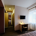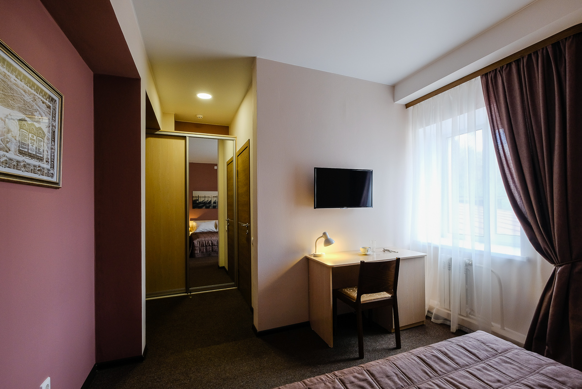 | Светлый и уютный номер площадью 20 кв.м. очарует вас своей привлекательностью классического романтизма. Номер рассчитан на проживание как одного, так и двух человек. В номере находится удобная двуспальная кровать, вместительный шкаф, письменный стол для работы, ЖК-телевизор, кондиционер и телефон для внутренней связи. Обеденные принадлежности. Сан.узел с душем совмещен в одной комнате, предоставляется зубной набор, шампунь, гель для душа, мыло, шапочка для душа, фен. В отеле есть бесплатный Wi-Fi который работает на всей его территории. В отеле Вы можете воспользоваться услугами кафе, где Вас сытно и вкусно накормят. Стоимость такого номера с условием проживания одного человека составляет 3300р. С условием проживания двух человек стоимость составляет 4100р. | |